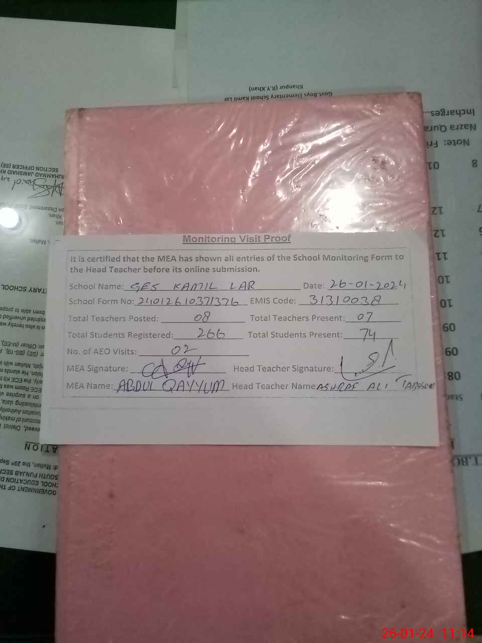 | Attendance Register | Head Teacher | MEA with School | Visit Proof |