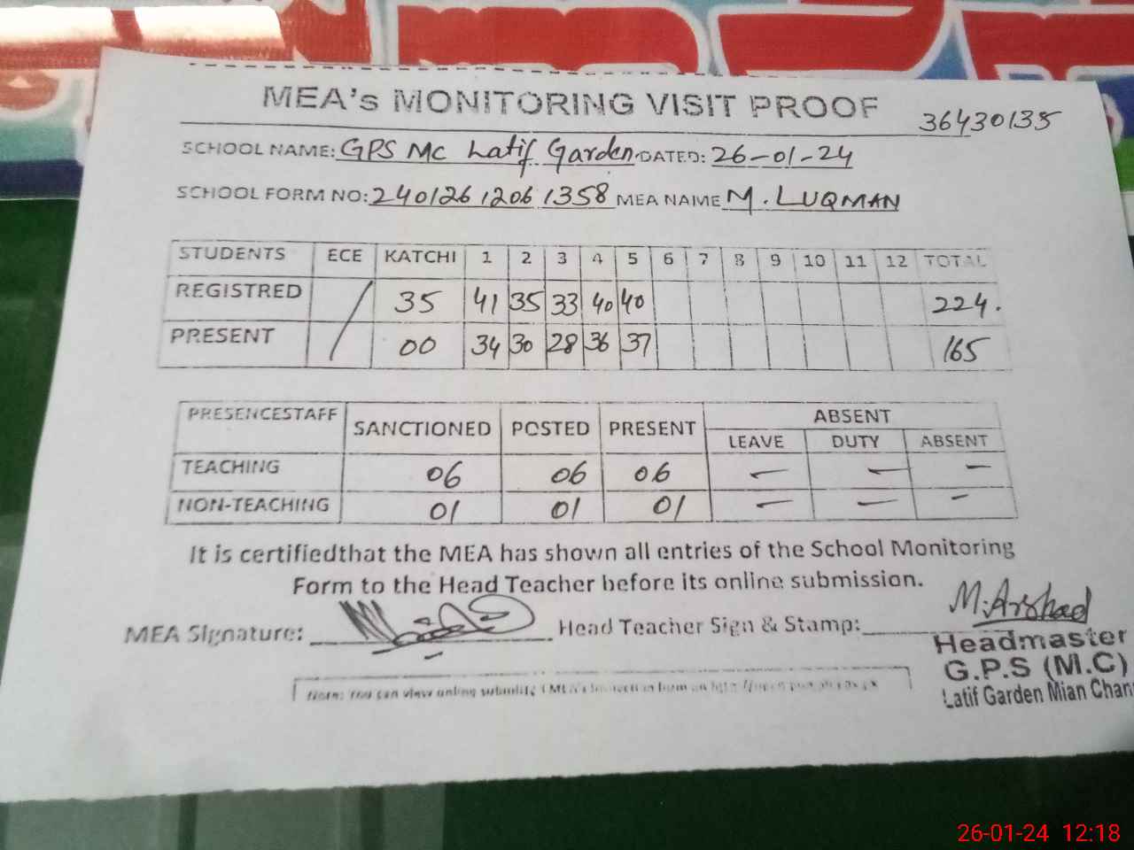 | EMIS Code: 36430135 | Name of School: GPS MC LATIF GARDEN SADIQ COLONY MIAN CHANNU | |||