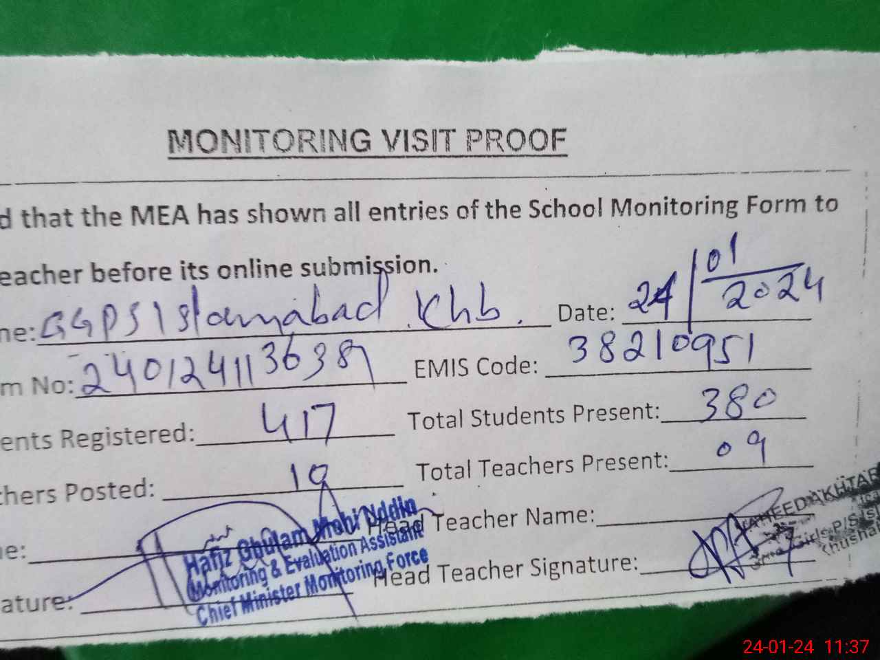 | Attendance Register | Head Teacher | MEA with School | Visit Proof |