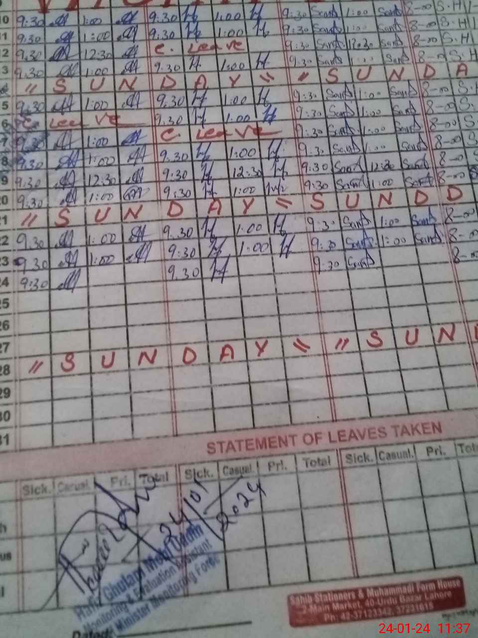| CNIC | Full Name | Designation | R/C | Absence During Last Calender Month |