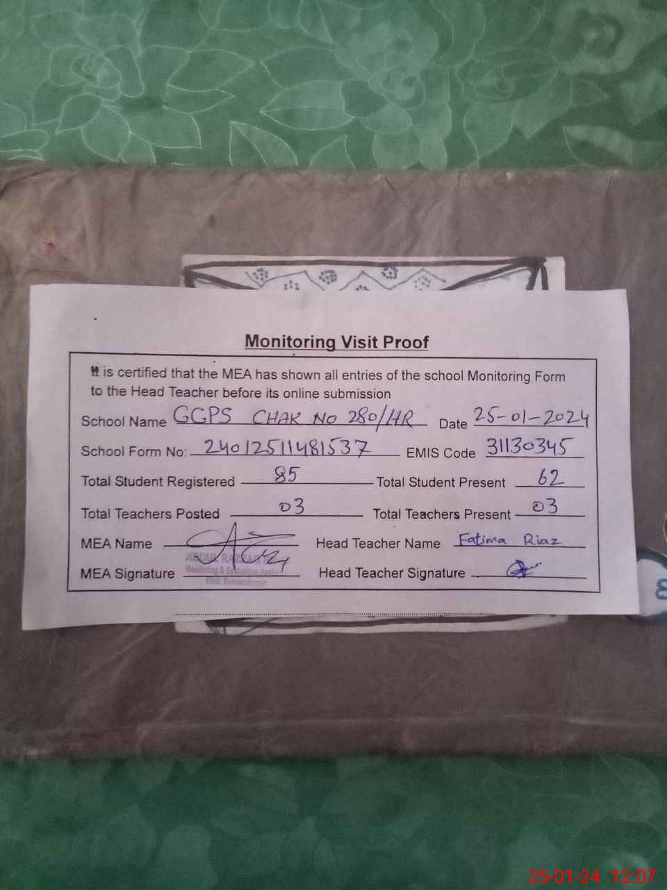 | EMIS Code: 31130345 | Name of School: GGPS CHAK NO 280 HR | |||