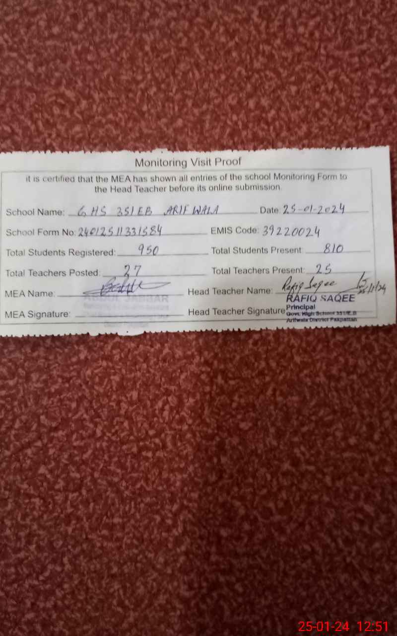 | EMIS Code: 39220024 | Name of School: GHS 351/EB ARIFWALA | |||