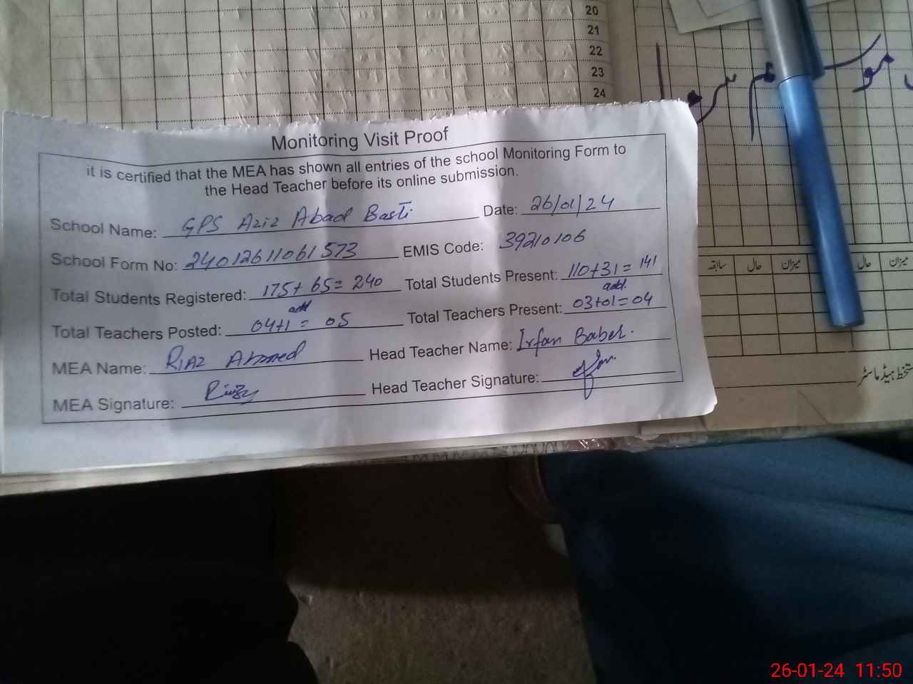 | Attendance Register | Head Teacher | MEA with School | Visit Proof |