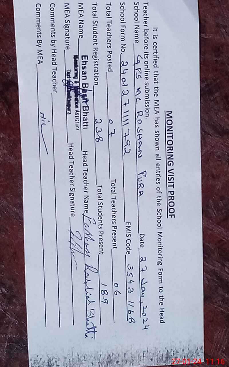 | EMIS Code: 35431168 | Name of School: GPS MC ROSHAN PURA | |||