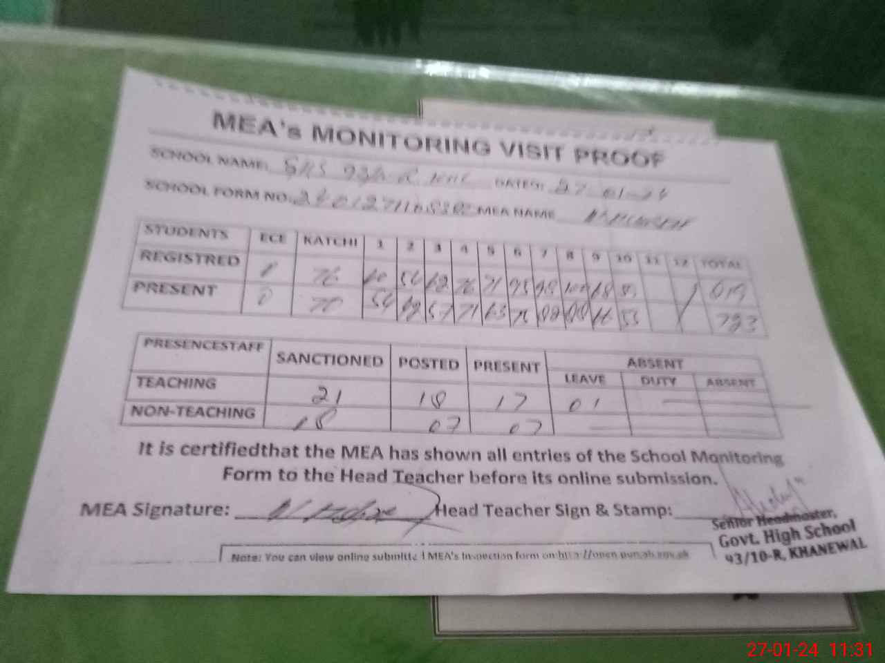 | Attendance Register | Head Teacher | MEA with School | Visit Proof |
