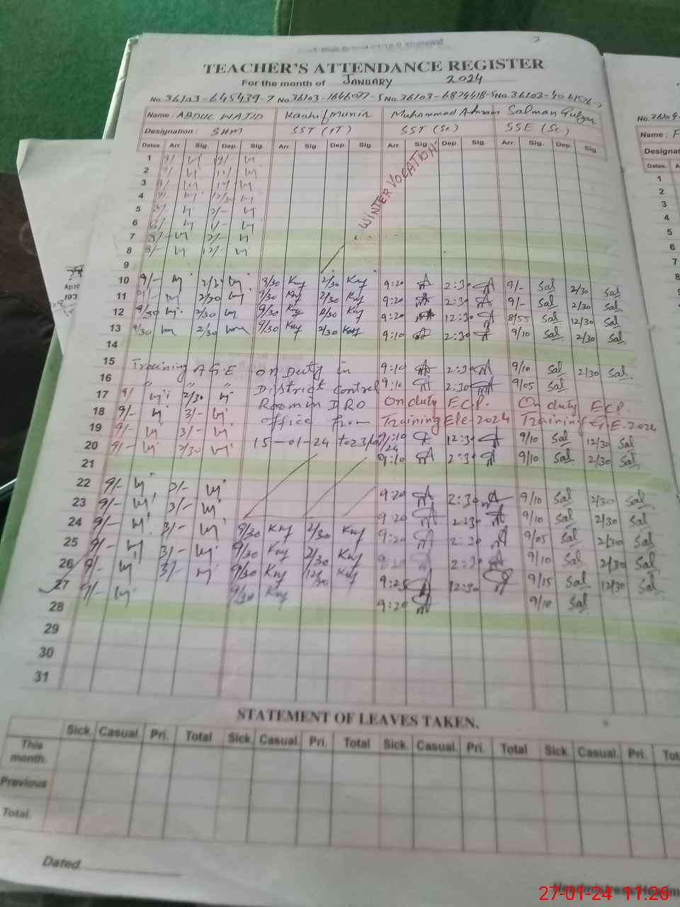 | Leave | Duty | Absent | Maternity | Medical | Ex- Pak |