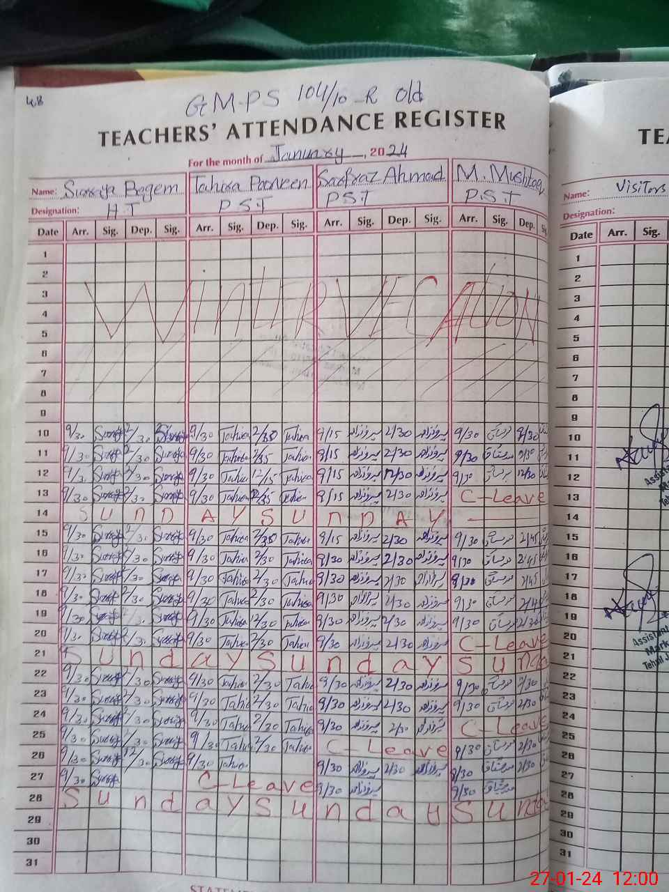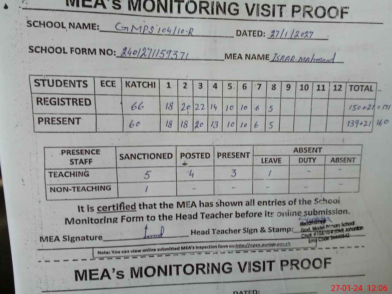 | Attendance Register | Head Teacher | MEA with School | Visit Proof |