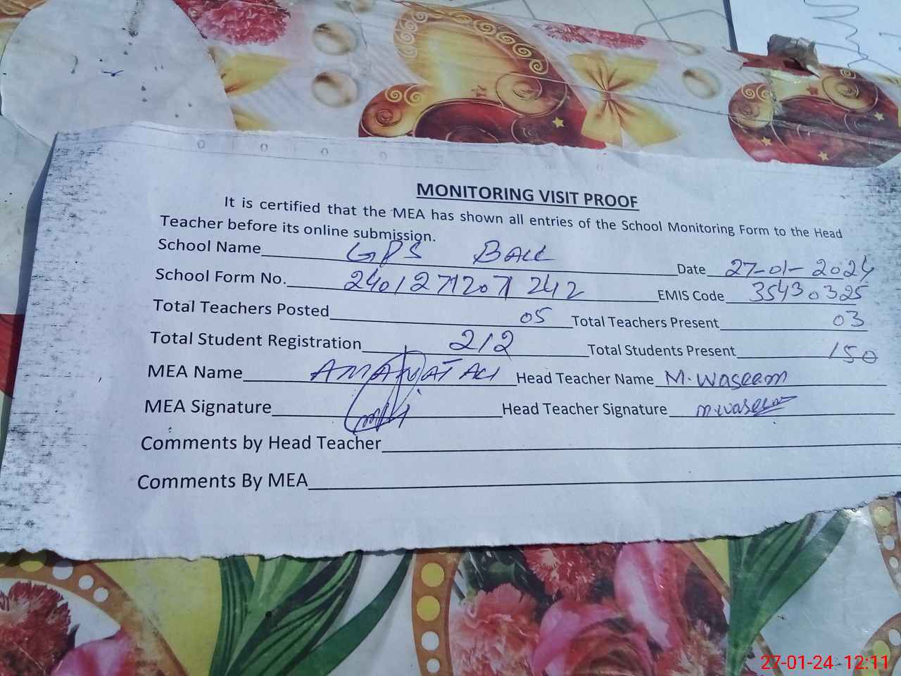 | Attendance Register | Head Teacher | MEA with School | Visit Proof |