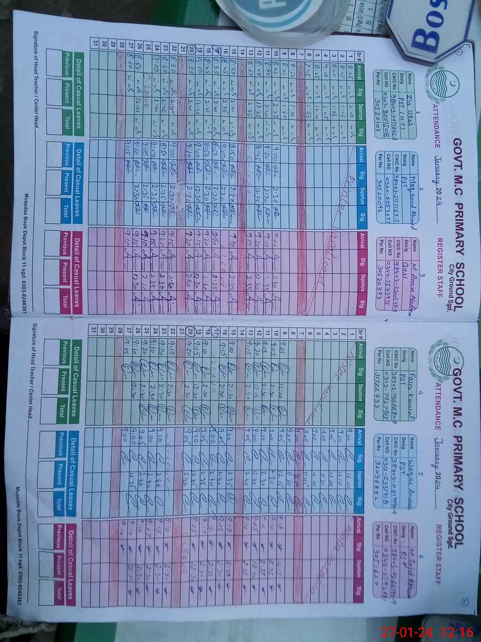 | CNIC | Full Name | Designation | R/C | Absence during last cal. month |