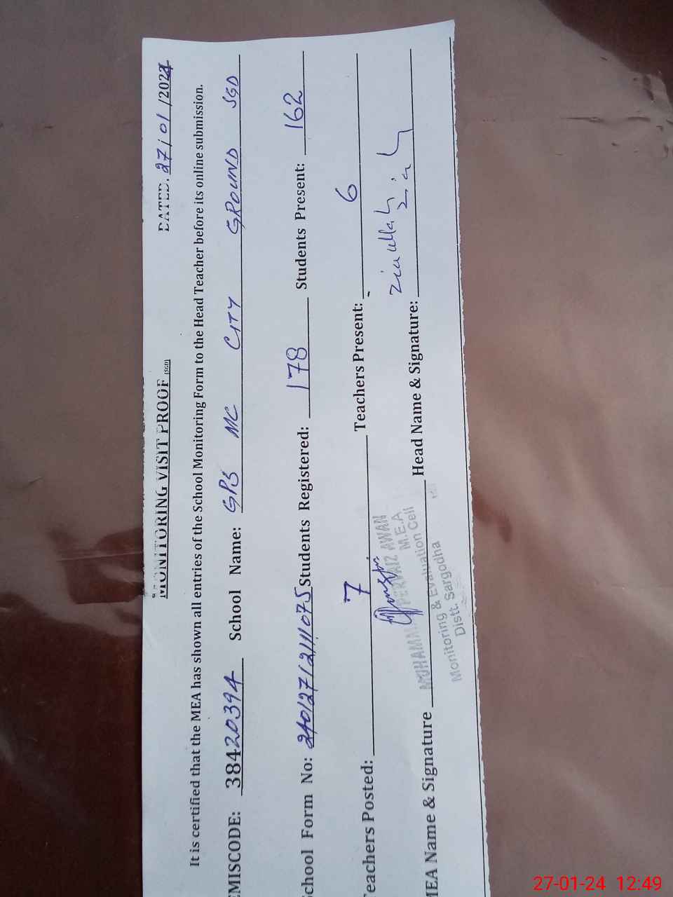| Attendance Register | Head Teacher | MEA with School | Visit Proof |