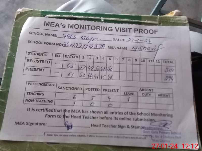 | Attendance Register | Head Teacher | MEA with School | Visit Proof |