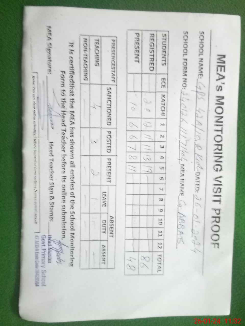 | Attendance Register | Head Teacher | MEA with School | Visit Proof |