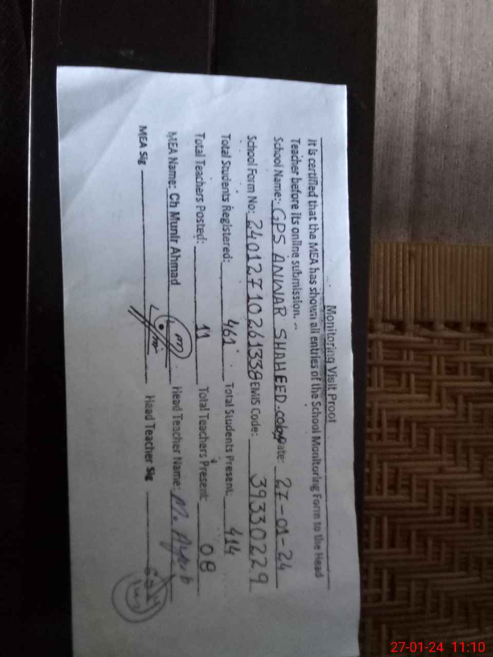 | EMIS Code: 39330229 | Name of School: GPS ANWAR SHAHEED COLONY | |||