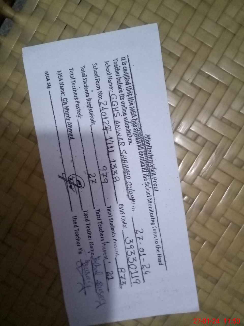 | EMIS Code: 39330119 | Name of School: GGHS ANWAR SHAHEED COLONY | |||