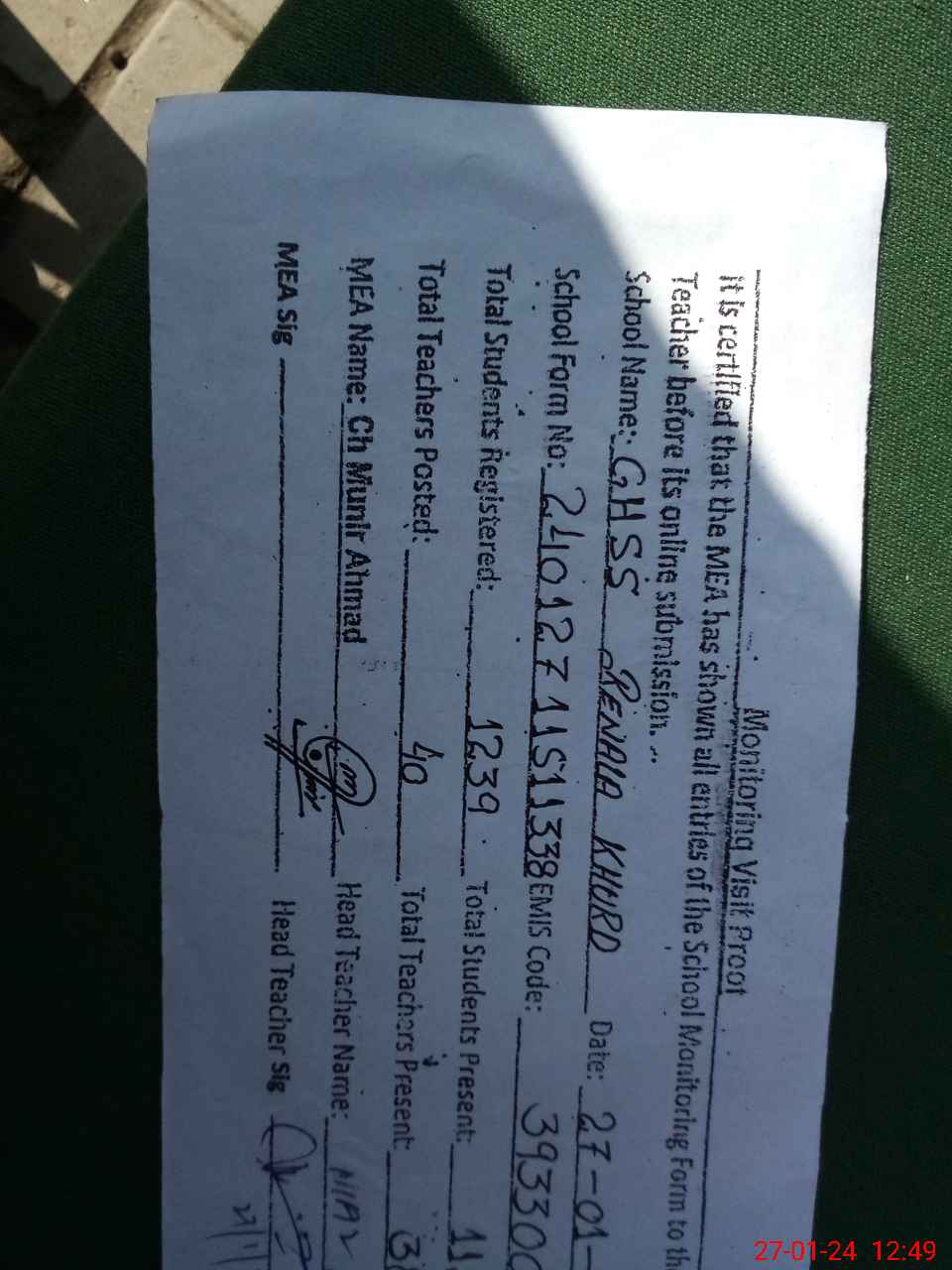 | Certified that this School was Inspected by the Undersigned MEA/DMO Today and the Information Stated Above is as Per Record. | |||||