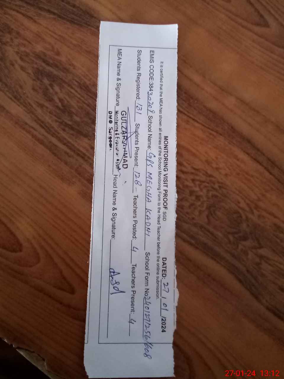 | Attendance Register | Head Teacher | MEA with School | Visit Proof |
