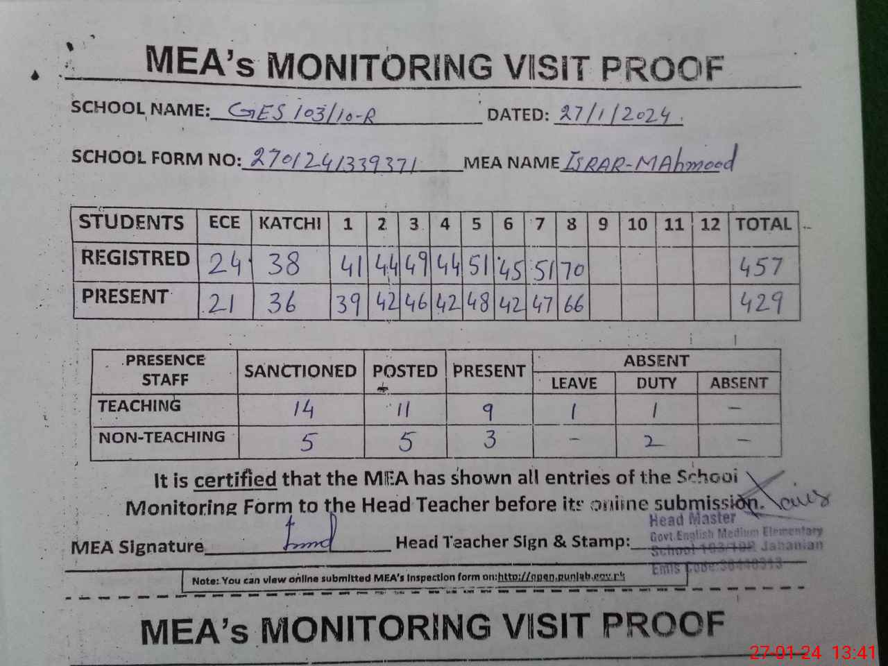 | Attendance Register | Head Teacher | MEA with School | Visit Proof |