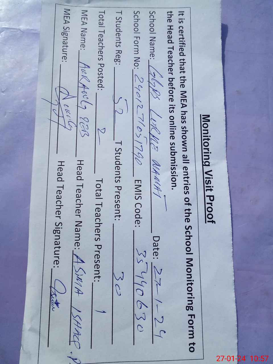 | Attendance Register | Head Teacher | MEA with School | Visit Proof |