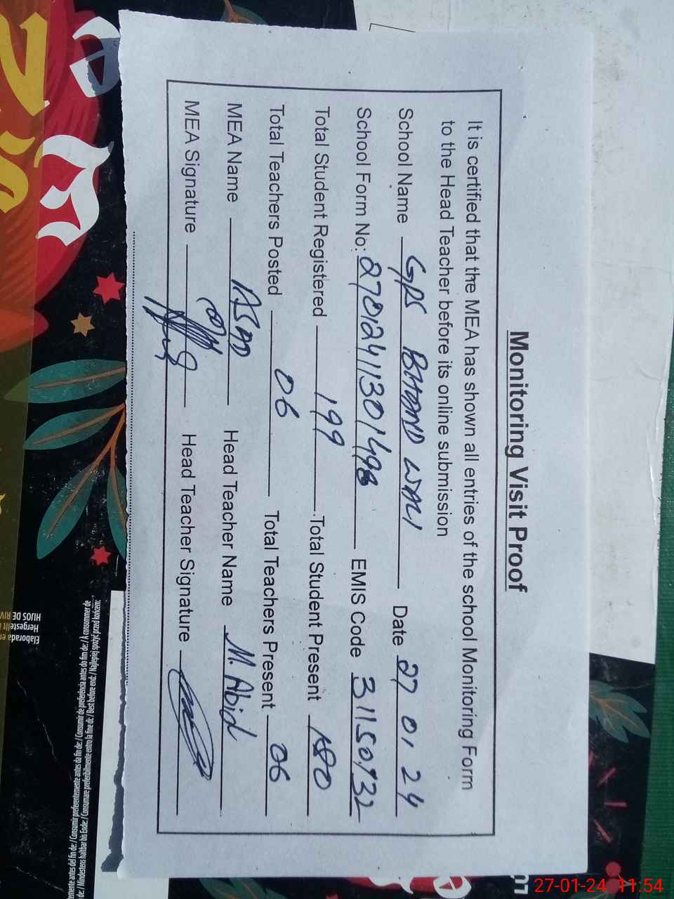 | Attendance Register | Head Teacher | MEA with School | Visit Proof |
