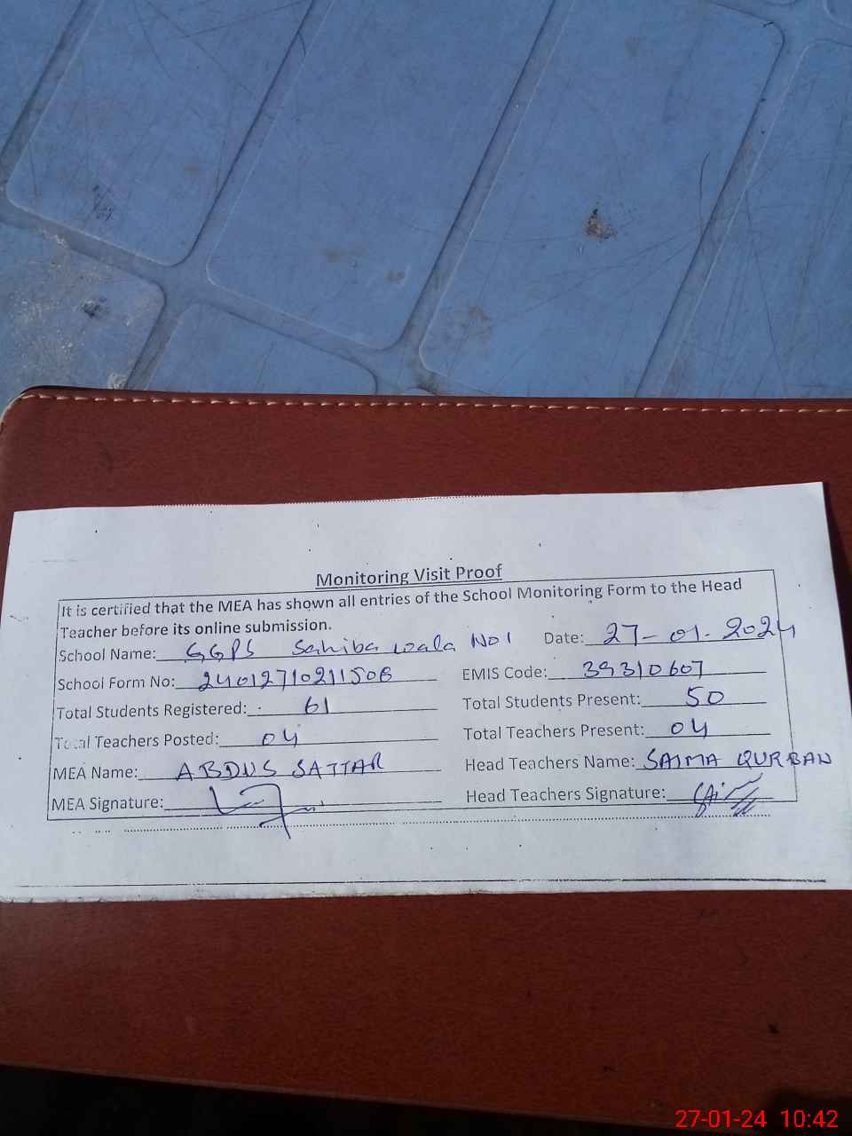 | Attendance Register | Head Teacher | MEA with School | Visit Proof |