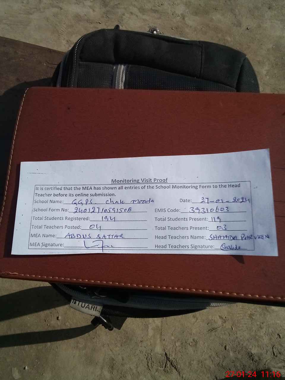 | Attendance Register | Head Teacher | MEA with School | Visit Proof |