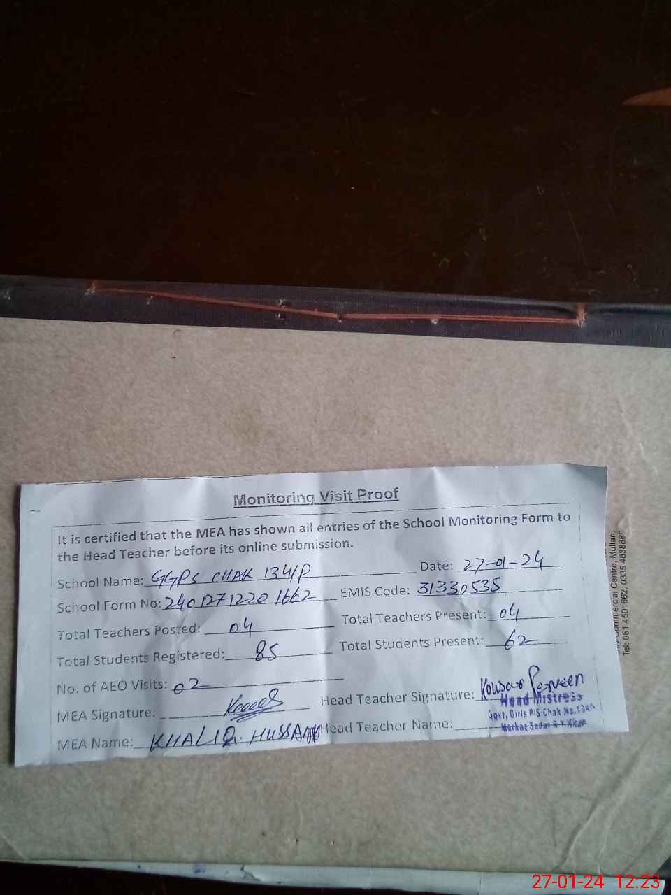 | Attendance Register | Head Teacher | MEA with School | Visit Proof |