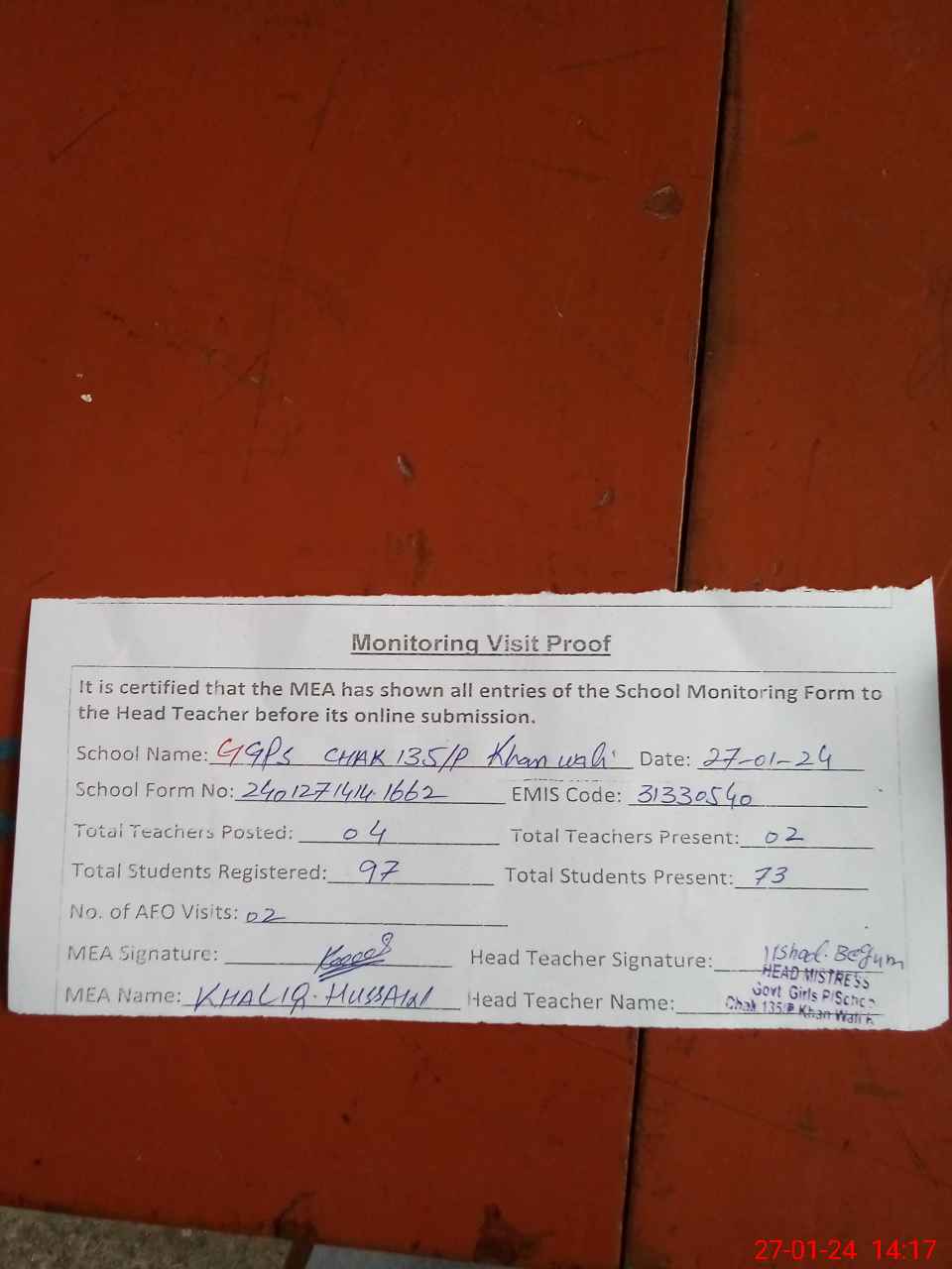 | EMIS Code: 31330540 | Name of School: GGPS CHAK 135/P KHAN WALI | |||