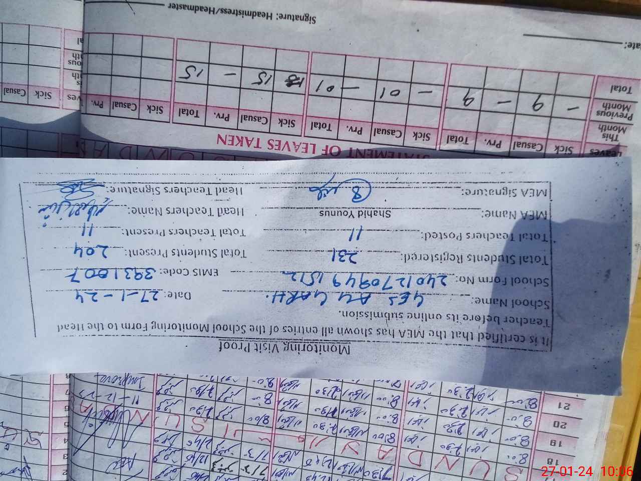 | Attendance Register | Head Teacher | MEA with School | Visit Proof |