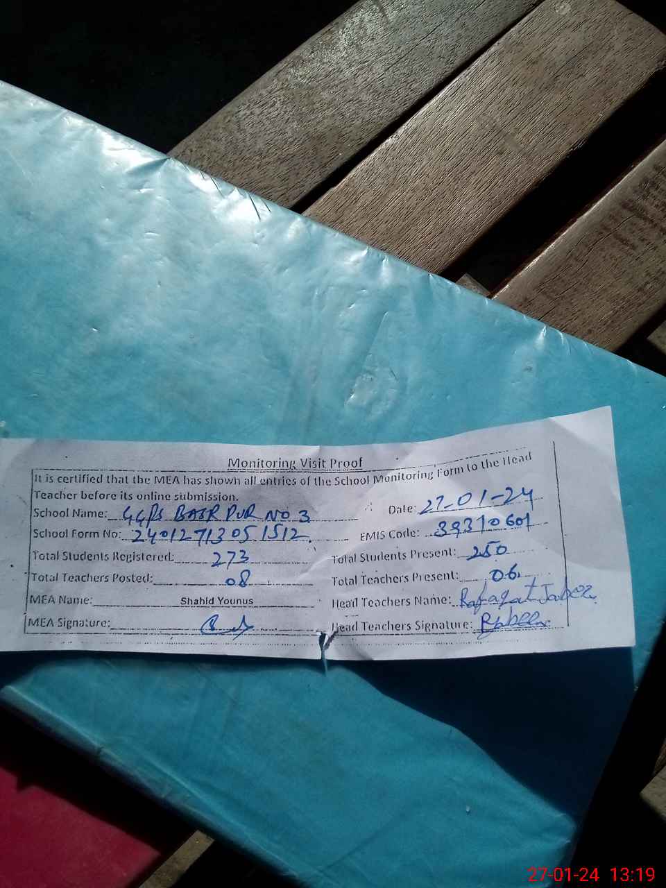| Attendance Register | Head Teacher | MEA with School | Visit Proof |