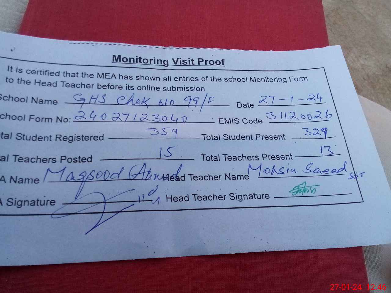 | Attendance Register | Head Teacher | MEA with School | Visit Proof |