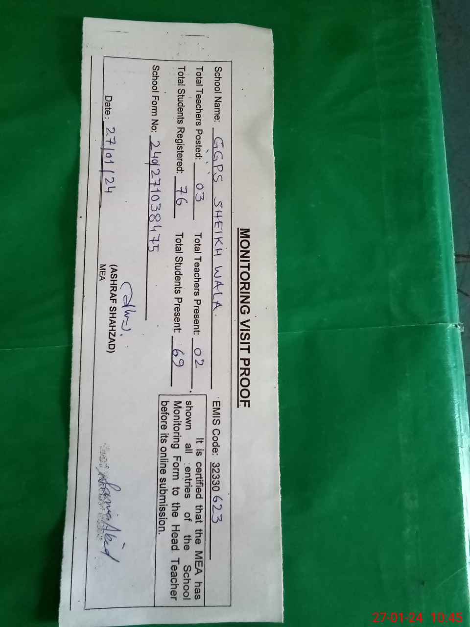 | Monitoring Date: 27-01-2024 | Start Time: 27-01-2024 10:20 AM | End Time: 27-01-2024 10:48 AM | Name of MEA: Mu**** As**** Sh**** | |