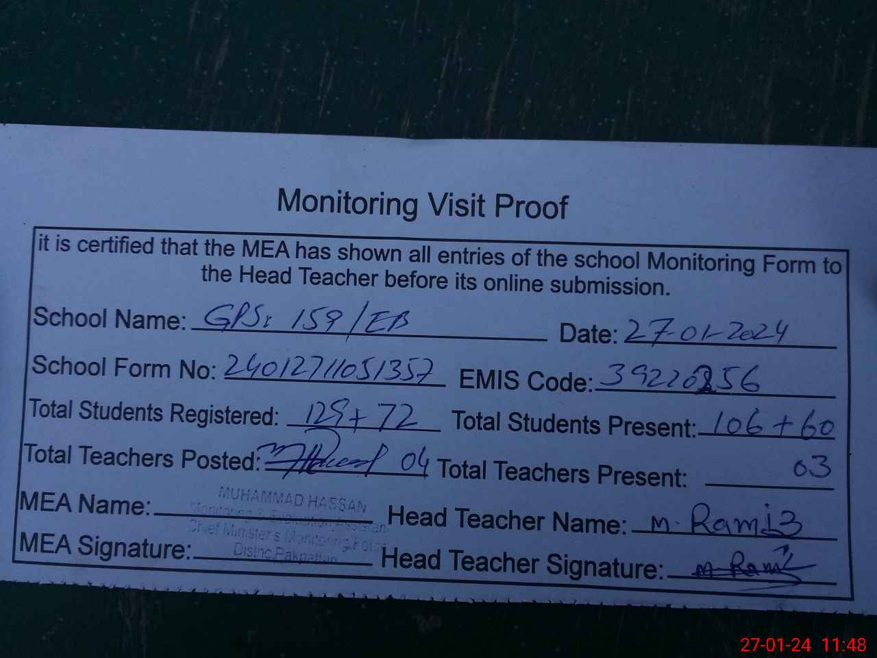 | EMIS Code: 39220256 | Name of School: GPS 159 EB P.O ARIF WALA | |||