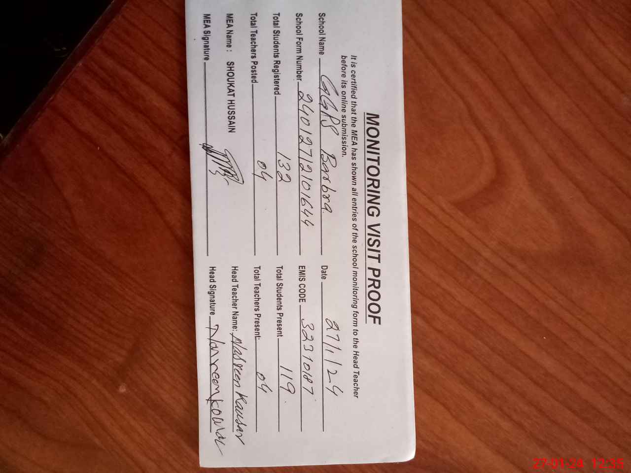 | Attendance Register | Head Teacher | MEA with School | Visit Proof |