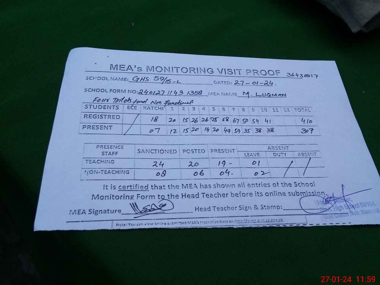 | Attendance Register | Head Teacher | MEA with School | Visit Proof |