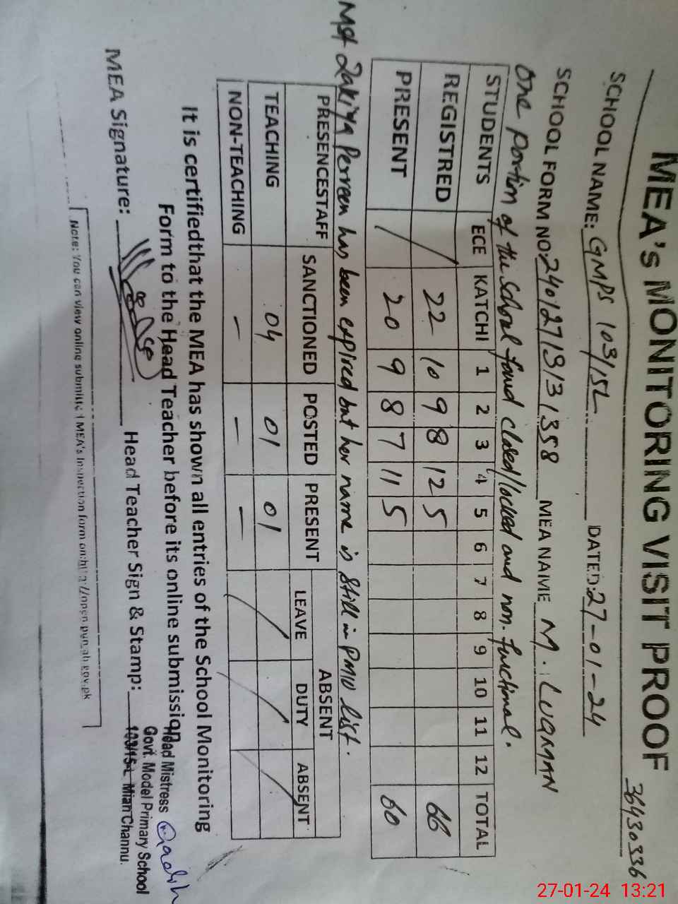| EMIS Code: 36430336 | Name of School: GMPS 103/15-L, MIAN CHANNU | |||