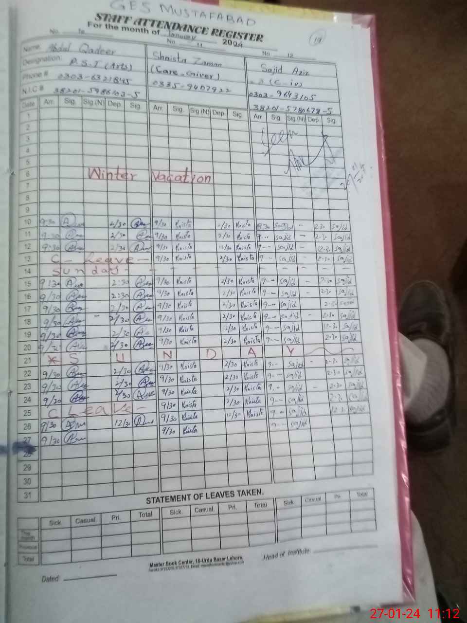 | CNIC | Full Name | Designation | R/C | Absence During Last Calender Month |