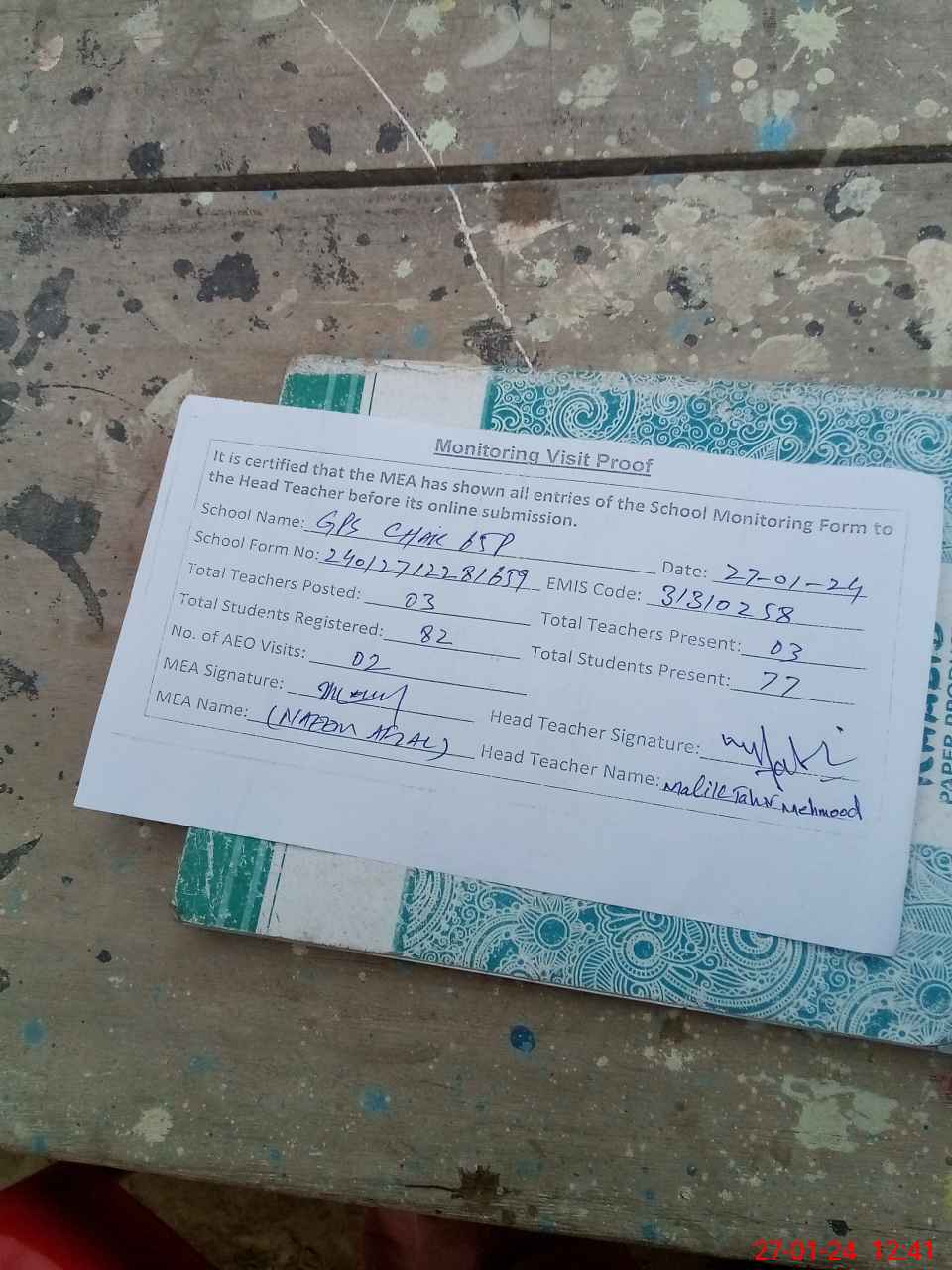 | Attendance Register | Head Teacher | MEA with School | Visit Proof |