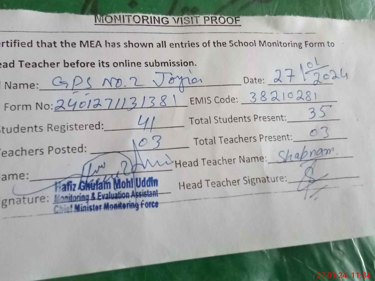 | EMIS Code: 38210281 | Name of School: GPS NO. 2 JOYIA | |||