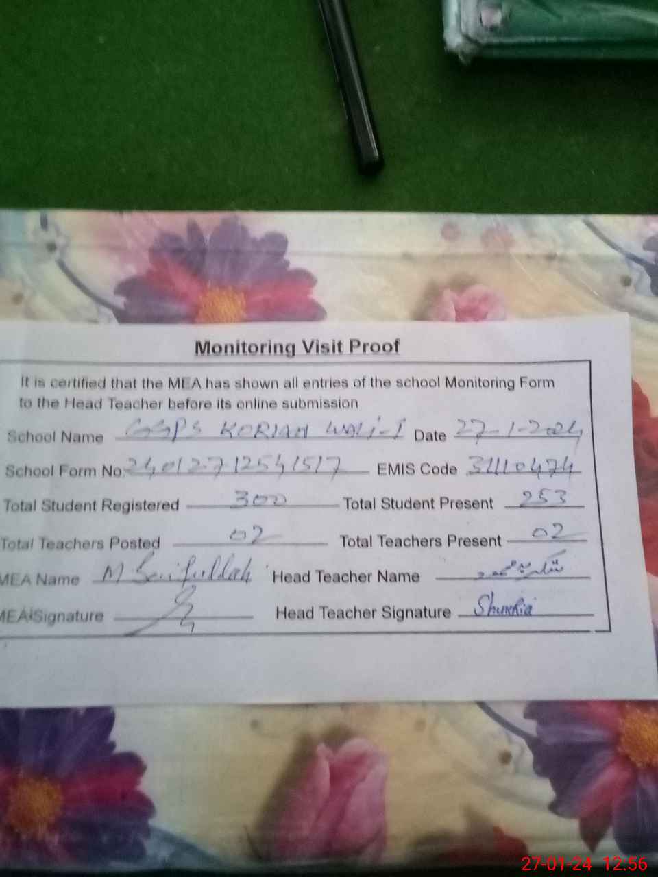 | Attendance Register | Head Teacher | MEA with School | Visit Proof |