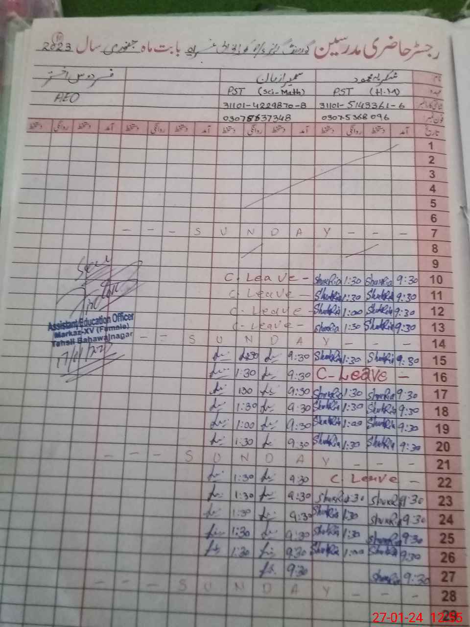| Name: Sh**** ME**** Designation: (School Headmaster's/Headmistress's) PST Phone/Cell Number: 03**** |