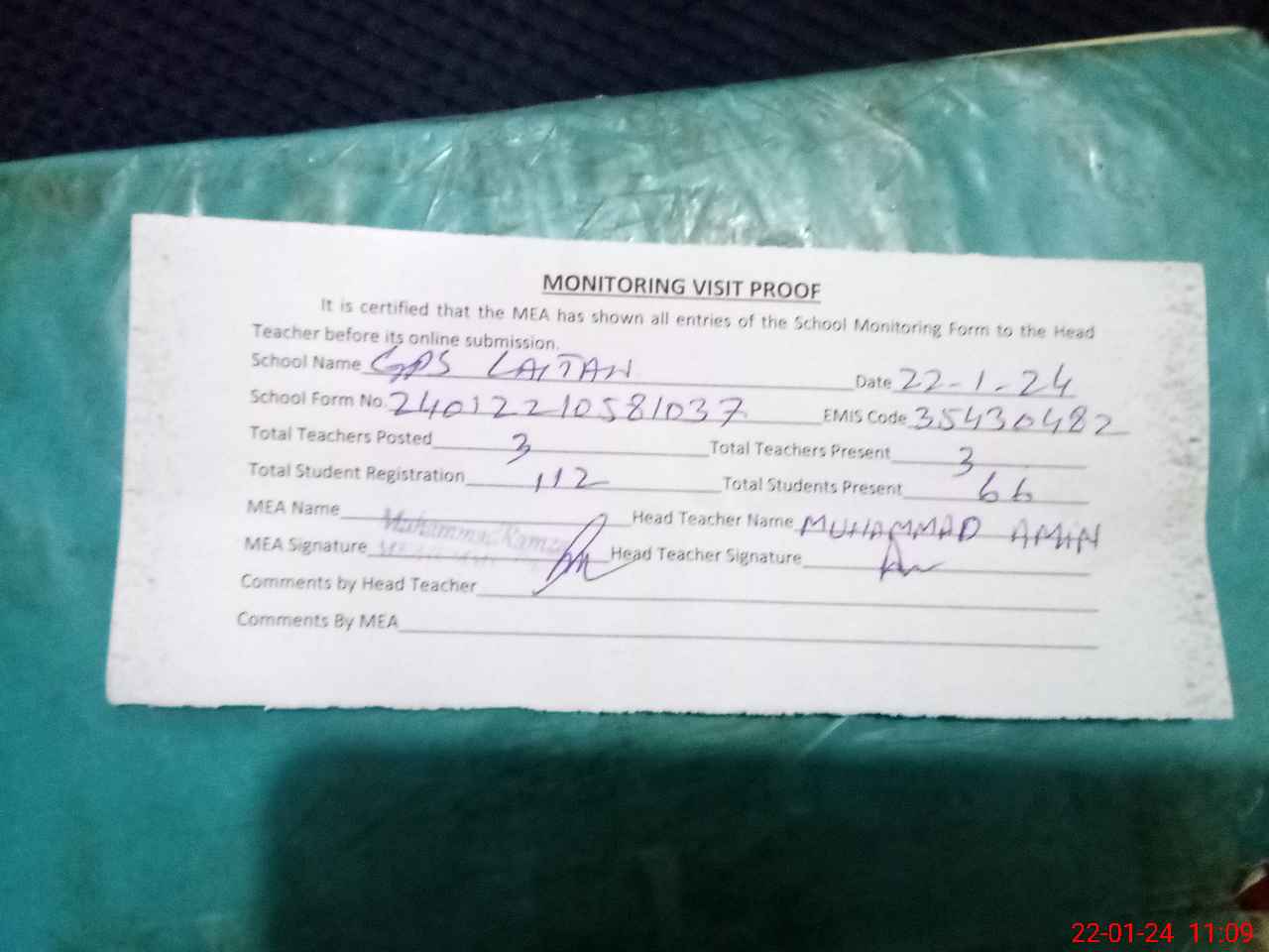 | Attendance Register | Head Teacher | MEA with School | Visit Proof |