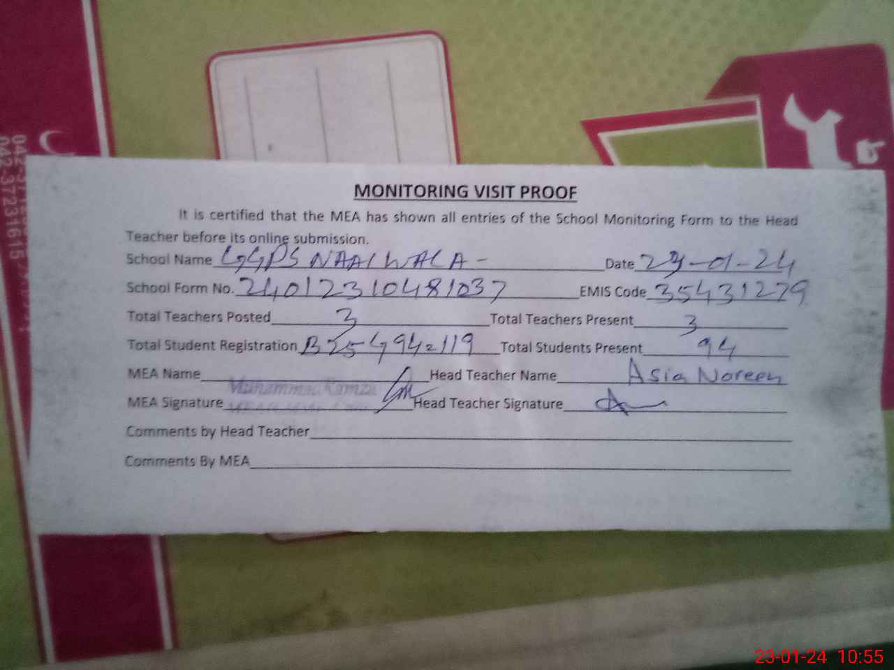 | Attendance Register | Head Teacher | MEA with School | Visit Proof |