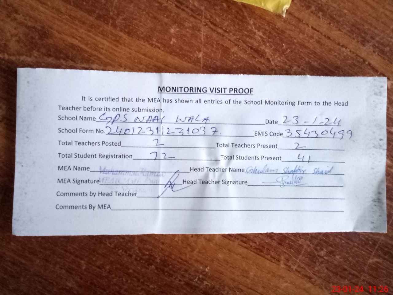 | Attendance Register | Head Teacher | MEA with School | Visit Proof |