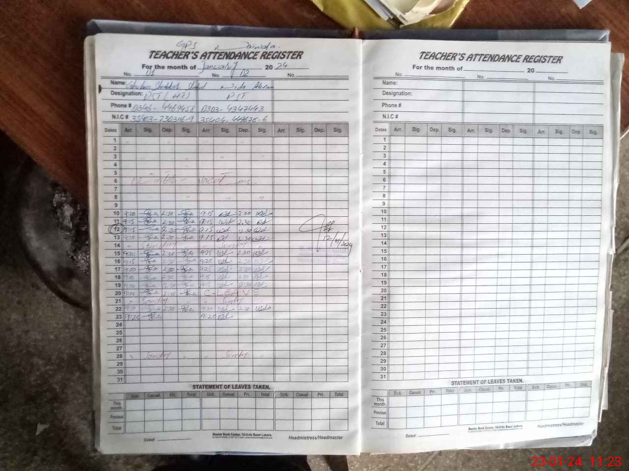 | CNIC | Full Name | Designation | R/C | Absence During Last Calender Month |
