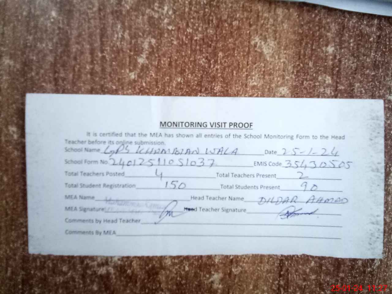 | Attendance Register | Head Teacher | MEA with School | Visit Proof |