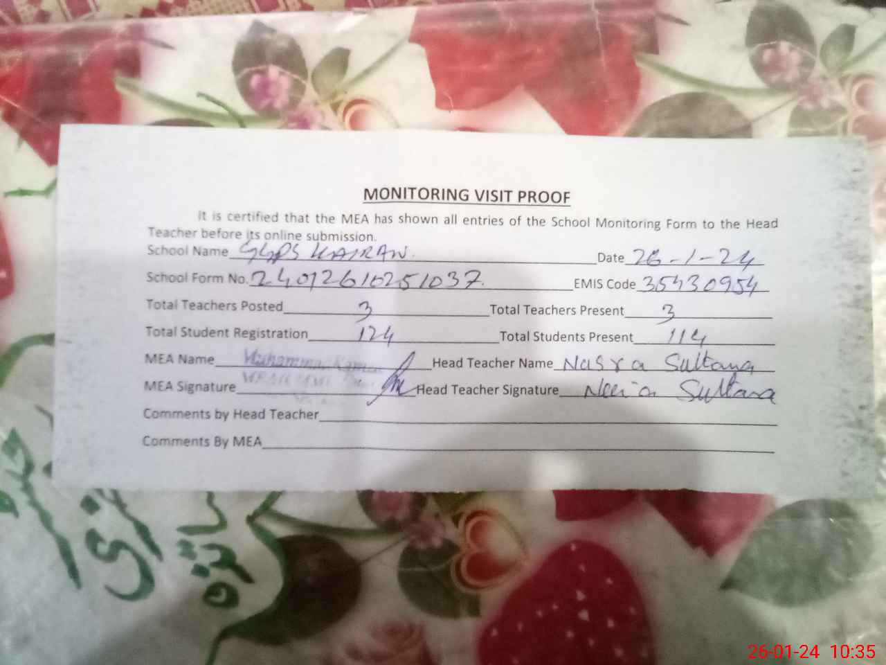 | Attendance Register | Head Teacher | MEA with School | Visit Proof |