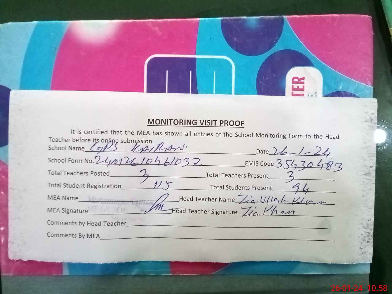 | Attendance Register | Head Teacher | MEA with School | Visit Proof |