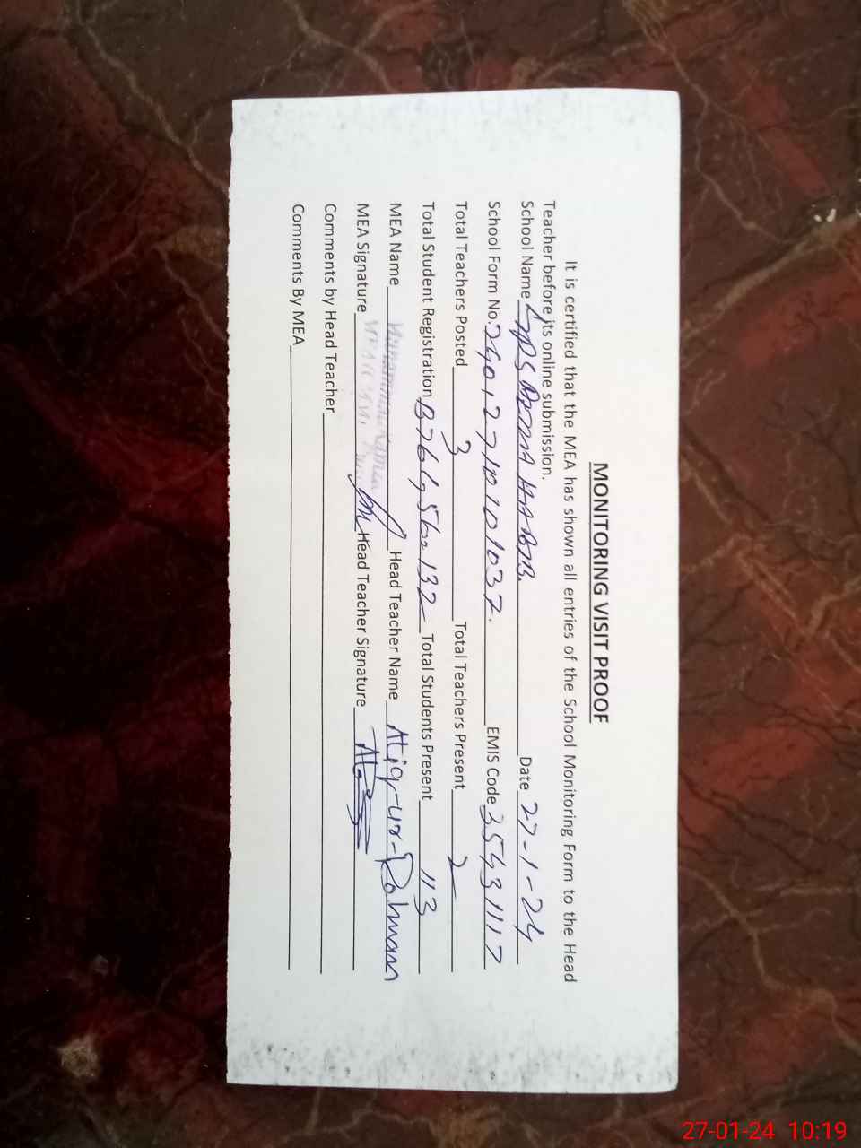 | Attendance Register | Head Teacher | MEA with School | Visit Proof |