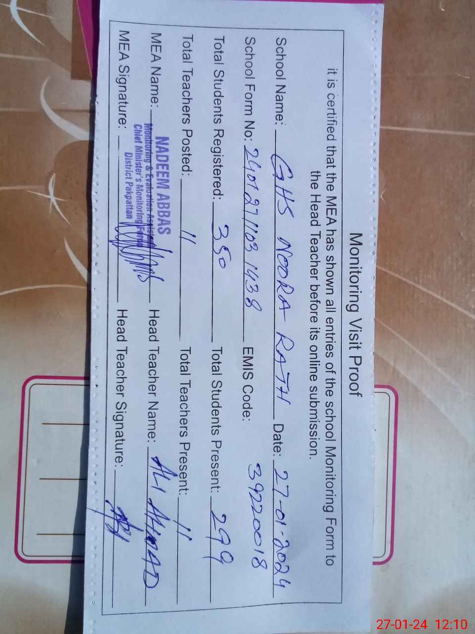 | Attendance Register | Head Teacher | MEA with School | Visit Proof |