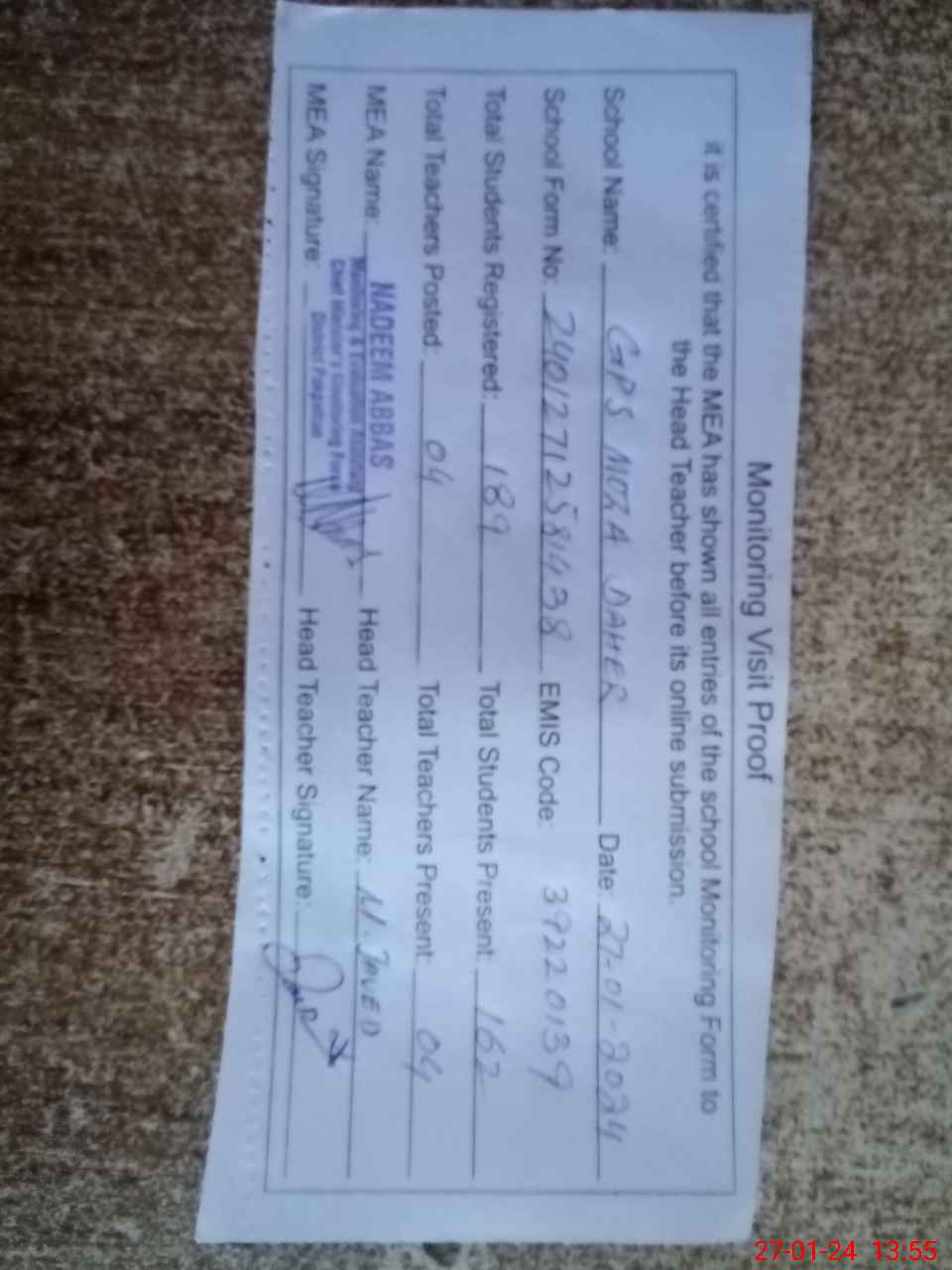 | Attendance Register | Head Teacher | MEA with School | Visit Proof |